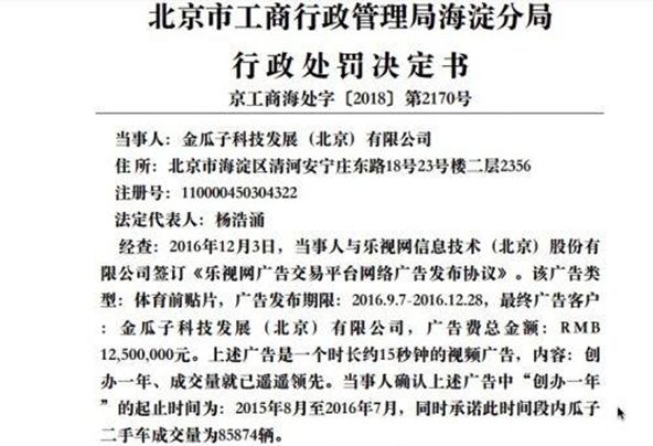 六、表示品牌地位的相關詞語 9 王牌、領袖品牌、世界領先、遙遙領先、領導者、締造者、創領品牌、領先上市、至尊、巔峰、領袖、之王、王者、冠軍、地王、樓王等用語。 ⊙ 違法案例11-瓜子二手車:不實廣告宣傳語被罰 2018年11月15日,金瓜子科技發展(北京)有限公司因在廣告中使用瓜子二手車“創辦一年、成交量就已遙遙領先”的不實宣傳語,被罰款1250萬元。