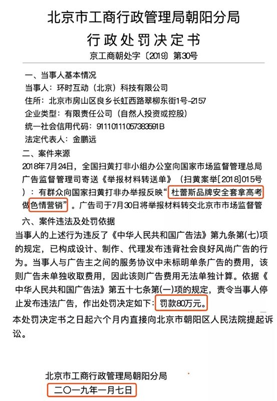 ⊙ 違規案例17-杜蕾斯:高考軟色情營銷 2018年7月24日,環時互動因為杜蕾斯品牌做高考軟色情營銷,被罰款80萬元。