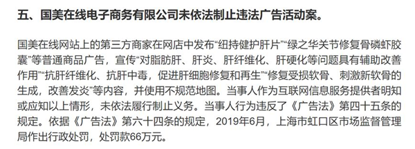 十三、限定時間的表述 16 限時須有具體時限,所有團購須標明具體活動日期,例如今日、今天、幾天幾夜、倒計時、趁現在、就、僅限、周末、周年慶、特惠趴、購物大趴、閃購、品牌團、精品團、單品團,嚴禁使用隨時結束、僅此一次、隨時漲價、馬上降價、最后一波等無法確定時限的詞語。 十四、普通商品包含疑似醫療用語 17 全面調整人體內分泌平衡、增強或提高免疫力、助眠、失眠、滋陰補陽、壯陽。 18 消炎、可促進新陳代謝、減少紅血絲、產生優化細胞結構、修復受損肌膚、治愈(治愈系除外)、抗炎、活血、解毒。 19 減肥、清熱解毒、清熱袪濕、治療、除菌、殺菌、抗菌、滅菌、防菌、消毒、排毒。 20 防敏、柔敏、舒敏、緩敏、脫敏、抗敏、褪敏、改善敏感肌膚、改善過敏現象、降低肌膚敏感度。 21 鎮定、鎮靜、理氣、行氣、活血、生肌、補血、安神、養腦、益氣、通脈。 22 胃脹蠕動、利尿、驅寒解毒、調節內分泌、延緩更年期、補腎、祛風、生發。 23 防癌、抗癌、 24 祛疤、降血壓、防治高血壓、治療。 25 改善內分泌、平衡荷爾蒙、防止卵巢及子宮的功能紊亂、去除體內毒素、吸附鉛汞。 26 除濕、潤燥、治療腋臭、治療體臭、治療陰臭。 27 美容治療、消除斑點、斑立凈、無斑、治療斑禿、逐層減退多種色斑、妊娠紋。 28 毛發新生;毛發再生;生黑發;止脫;生發止脫;脂溢性脫發;病變性脫發;毛囊激活、酒糟鼻;傷口愈合清除毒素; 29 緩解痙攣抽搐、減輕或緩解疾病癥狀、處方、藥方、經××例臨床觀察具有明顯效果。 30 丘疹、膿皰、手癬、甲癬、體癬、頭癬、股癬、腳癬、腳氣、鵝掌癬、花斑癬、牛皮癬、傳染性濕疹。 31 傷風感冒、經痛、肌痛、頭痛、腹痛、便秘、哮喘、支氣管炎、消化不良。 32 刀傷、燒傷、燙傷、瘡癰、毛囊炎、皮膚感染、皮膚面部痙攣等疾病名稱或癥狀。 33 細菌、真菌、念珠菌、糠秕孢子菌、厭氧菌、牙孢菌、痤瘡、毛囊寄生蟲等微生物名稱。 34 雌性激素、雄性激素、荷爾蒙、抗生素、激素。 35 藥物、中草藥、中樞神經。 36 細胞再生、細胞增殖和分化、免疫力、患處、疤痕、關節痛、凍瘡、凍傷。 37 皮膚細胞間的氧氣交換、紅腫、淋巴液、毛細血管、淋巴毒等。 38 其他涉及疾病治療功能、疾病名稱的醫療用語。 ⊙ 違法案例23-國美在線:未依法制止違法廣告活動 2019年12月12日,國美在線網站上的第三方商家在網店中發布宣傳有治療功效的普通食品違法廣告,國美在線未依法履行制止義務,被罰款66萬元。