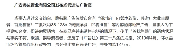 十二、激發消費者搶購心理的表述 15 秒殺、搶爆、再不搶就沒了、不會再便宜了、錯過就沒機會了、萬人瘋搶、搶瘋了、售罄、售空、史上最低價、錯過不再/錯過即無、全民瘋搶/搶購、免費領、0首付、零距離、價格你來定等激發搶購心理的詞語。 ⊙ 違法案例22-廣安鑫達置業:“首批售罄”被罰 2019年10月,四川廣安鑫達置業有限公司因發布的廣告中包含“首批售罄”字樣,被罰款12萬元。
