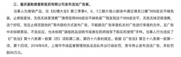 十五、醫療廣告違禁詞(包括醫院、藥品、醫療器械) 39 當天就見效、XX天從根好、治愈率為XX%、輕松告別、都治好、延長生命、醫療水平最高、更安全、恢復快、零事故、零擔憂、完全清除、一次性治愈不復發、無一人復發、全部康復、徹底消除、顯著改善等對醫療效果做出保證性承諾的詞語。 40 未標明“請按藥品說明書或者在藥師指導下購買和使用”字樣。 ⊙ 違法案例26-999皮炎平:藥品廣告標示不明被罰 2019年12月17日,999皮炎平因在《吐槽大會》第三季第4、6、7三期片尾小劇場中通過演員口播廣告,但未標明禁忌、不良反應,也未標明“請按藥品說明書或者在藥師指導下購買和使用”字樣,被罰款90萬元。