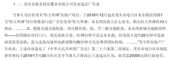 十七、房地產廣告違禁詞 42 收益穩健、保證升值、無憂保障、穩定收益、即買即收租金、升值價值、價值洼地、價值天成、投資回報、眾籌、抄漲、炒股不如買房、升值潛力無線、買到即賺到等對升值或者投資回報的承諾性詞語。 43 XX分鐘可達火車站/機場/高速、僅需XX分鐘等以項目到達某一具體參照物的所需時間表示項目位置的詞語。 44 一河一島五公園、兩河一湖四公園、XX醫院規劃建設中、XX城軌交通規劃中、XX文化館/體育館/學校規劃建設中、XXX學校近在咫尺、升學無憂、教育護航、九年制教育、一站式教育、入住學區房、優先入學、12年教育無憂、讓孩子贏在起跑線上等誤導消費的詞語。 45 其他對規劃或者建設中的交通、商業、文化教育設施以及其他市政條件作誤導宣傳的詞語。 ⊙ 違法案例29-搜房網:承諾升值投資回報 2019年9月,北京搜房網絡技術有限公司重慶分公司因發布含有“保障財富投資有回報”內容的廣告,被罰款15萬元。 ⊙ 違法案例30-新光投資置業:以到達時間表示位置 茂名市新光投資置業有限公司因發布“濱灣路在項目門口,鄰近南海大道,約15分鐘可直達水東港”、“經茂南大道約20分鐘可連接深茂深茂高鐵”等內容的廣告,被罰款2萬元。