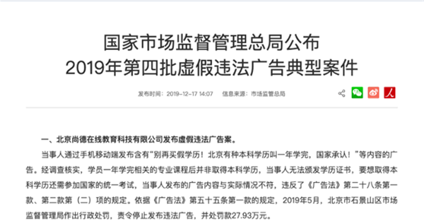 十八、教育培訓廣告違禁詞 46 記憶效率提升百倍、成績飛躍、過目不忘、7天記住永不忘、通過率XX%、高分王者、名列前茅、締造傳奇、百分百高薪就業、國家承認等對培訓效果、獲得學位學歷等作出保證性承諾的詞語。 47 命題專家聯手、圈定考試范圍、通往北大/清華的金鑰匙等暗示有考試命題人員參與培訓的詞語。 ⊙ 違法案例31-尚德教育:虛構頒發學歷資質 北京尚德在線教育科技有限公司在廣告中宣稱“一年學完,國家承認”,實際無法頒發學歷證書,被罰款27.93萬元。