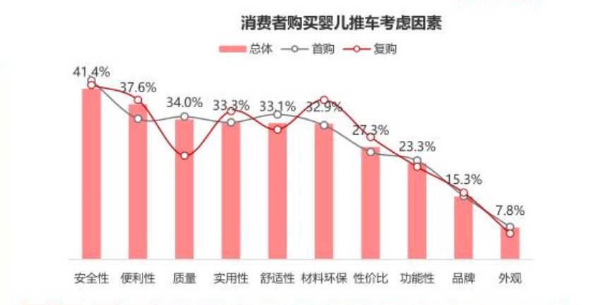 用戶群體以85后的年輕用戶為主,多集中在26-35歲之間,其中,未婚用戶比例更是占到40%。在城市分布方面,二四線城市用戶占比較高,分別占到30%和25%,而一線城市僅占20%。 針對男性用戶近半,未婚消費者居多的用戶畫像可得出,童車、童床品類產(chǎn)品的送禮屬性較強,品牌方在營銷過程中可以添加“送禮選購”等方面的策劃和宣傳。 消費者購買嬰兒推車更關(guān)注產(chǎn)品的安全性,購買嬰兒床主要關(guān)注材料環(huán)保等因素 通過大數(shù)據(jù)分析和車床類購買意愿調(diào)研發(fā)現(xiàn),大多用戶會根據(jù)孩子的不同年齡段購買多輛童車。在這其中,首次購買嬰兒推車的消費者,其孩子的年齡大多在6個月以內(nèi),在產(chǎn)品購買方面較為注重安全性、推車產(chǎn)品質(zhì)量以及減震舒適度。而隨著孩子成長、出行不斷增多,更多的復(fù)購用戶購買需求逐漸從“減震舒適”轉(zhuǎn)變?yōu)?ldquo;輕巧便攜”,購買關(guān)鍵點則主要集中在便利性和實用性兩個方面。
