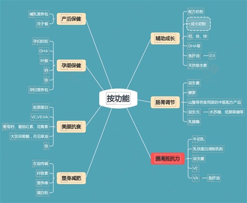 如果按劑型來做劃分的話,有粉劑、滴劑、片劑和膠囊。粉劑里面有調制乳粉和固體飲料。片劑和膠囊,如果不是藍帽子,不是保健食品的話,這兩種劑型是不允許在普通食品里面出現(xiàn)的,所以就會派生出另外兩種劑型,叫壓片糖果和凝膠糖果。壓片糖果、凝膠糖果和固體飲料都有一個要求,必須要有糖的成分在里面。 下面是按功能來做的營養(yǎng)品劃分,也是營養(yǎng)品優(yōu)化策略的重點。左右兩邊是根據(jù)人群來劃分。