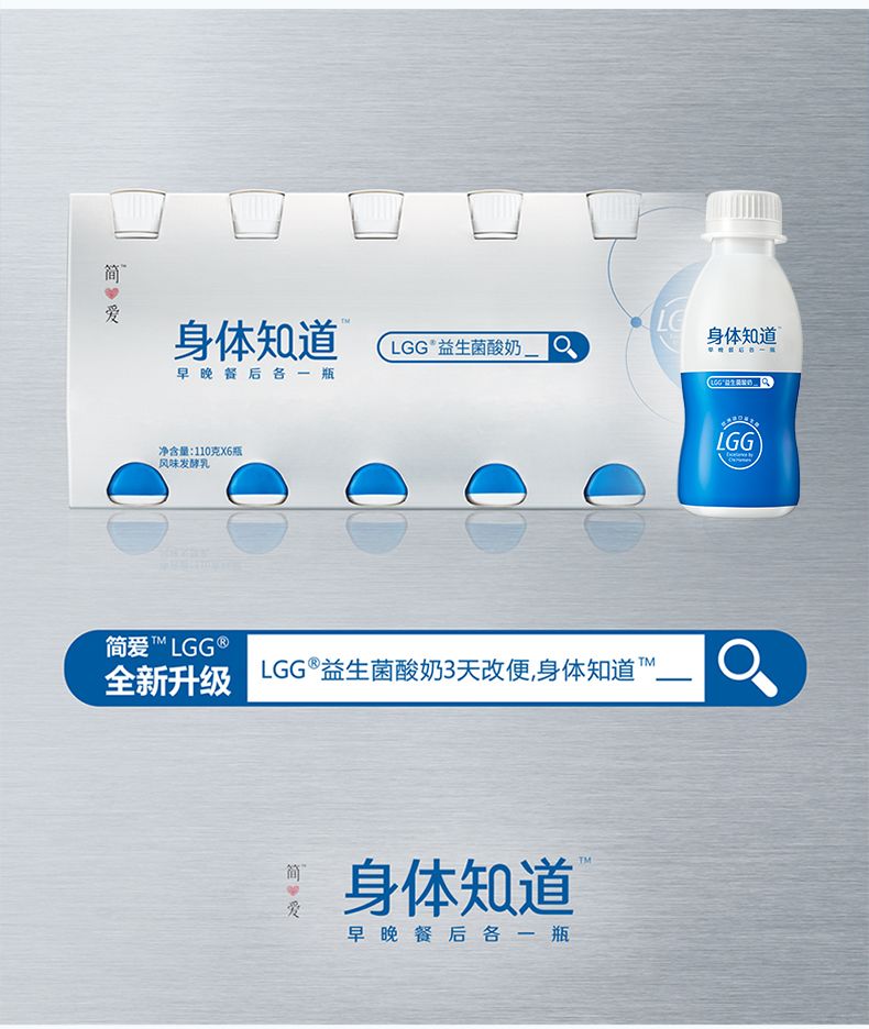 圖片來源:冠益乳官方微博 “標識認知”的策略必須要下足本:只有電梯手機廣告牌到處都能看到聽到“小藍帽”,看得到小藍帽和免疫力的關聯,才能在看到酸奶瓶上的小藍帽時產生對免疫力的聯想。 否則消費者很難從消費終端去解讀小藍帽的真正含義是什么,可能會和其他概念產生混淆。甚至會因為有“健康食品沒那么好吃”這樣的潛意識認知,使得他們看到一個象征健康食品的符號時,反而減低了食欲感。 2、細分場景:寡頭包圍的市場,如何用設計搶占新賽道? 如果說冠益乳的大規模投放就算想學也有心無力,那我們再來看看另一個乳制品品牌“簡愛”的更高性價比策略。 功能性產品市場大都被行業巨頭企業壟斷,乳品業有蒙牛伊利,功能性飲料有紅牛佳得樂等。但寡頭壟斷不代表其他品牌就沒有搶占市場份額的希望,反而意味著這個市場已經成熟到會領域開始細分,更多元細分的需求等待著新的品牌和去匹配。 新品類進入市場時需要培育消費者。除非是錢多人傻的大品牌,就一定要學會差異化競爭。 在一片紅海中想再去闖出自己的一片藍海,需要尋找自己的優勢。但絕不能是一個偽優勢。簡愛,在伊利蒙牛巨頭強勢占領的以常溫奶為主打的乳品市場,以極致純凈的獨特定位的低溫奶作為差異化的競爭優勢,切入高知家庭市場。 簡愛抓住了年輕一代消費者對天然有機、少糖減卡等健康食品的需求,突出“無添加”特色。滲透入一、二線城市的100萬+家庭,在以盒馬鮮生迅速占據No.1份額,在天貓等電商渠道也占據了酸奶品類第一。 我國低溫乳制品市場起步晚,鮮少有真正的益生菌功能型酸奶產品。簡愛針對功能型酸奶這一日益增長的市場需求,升級推出功能型子品牌“身體知道”,定位是:為亞健康消費者帶來可感知身體改善的功能型專業線酸奶品牌。 在包裝設計上,去除一切不必要的元素,藍白兩色打造科技感,以“身體知道”和“LGG益生菌”,直觀的傳達給消費者兩個信息:1、這款產品有你可以感知到的功能性;2、這款產品有專利科技。