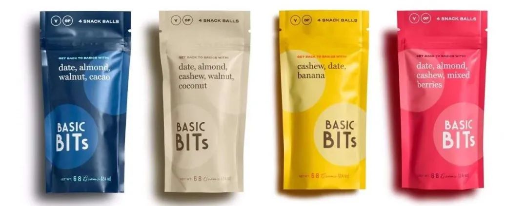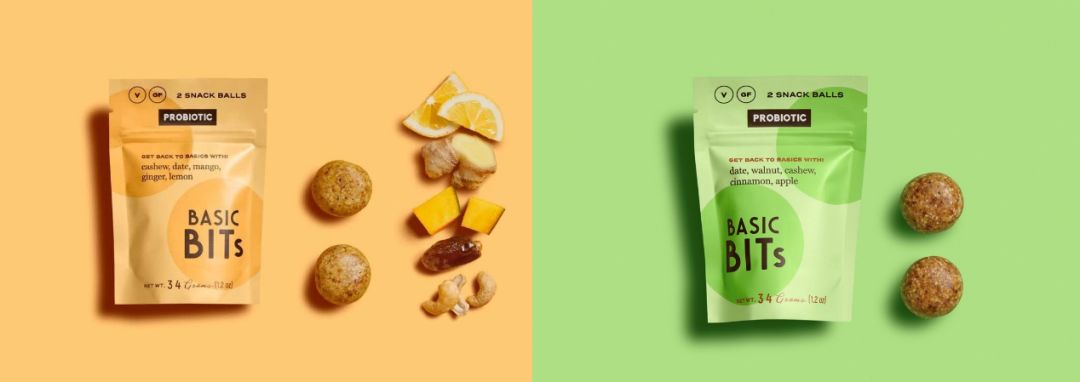 圖片來源:Basic Bits官網 廣告公司還為品牌拍攝了一組高度程式化的彩色照片,進一步強調了視覺概念。包裝標識清晰明了,忠于品牌使命,用有序的,不緊不慢的態度準確的告訴你每個包裝里有些什么。 在顏色的選擇上,用基礎調色盤中的顏色進一步加強了品牌返璞歸真到基礎成分的理念。該品牌的益生菌零食系列還衍生引入了一個二級調色板,大膽的顏色和簡單的關鍵信息快速抓住消費者注意力。