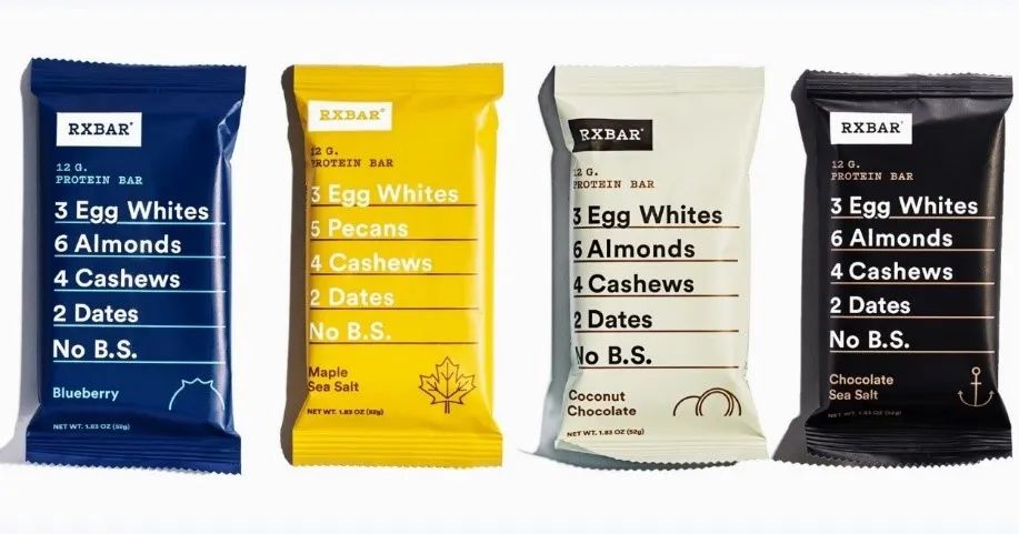 圖片來源:農夫山泉天貓旗艦店 其包裝設計完美體現了“高精科研感”,通身透明,沒有過多著色和廣告語,只有最顯眼的鋰水兩個大字和成分介紹的小字,會讓消費者產生“實驗室里貼著標簽的瓶子”這一最直觀的關于高科技的聯想。 4、清潔標簽:越簡單越好,告別花里胡哨的廣告語 清潔標簽這個詞這兩年在食品包裝界幾乎成為了最火的詞之一,據全球領先的市場調研機構Research and Markets數據,2023年全球清潔標簽市場將達475億美元,年復合增長率為6.8%[8]。 “清潔標簽”源于歐盟的一種主張,即在食品標簽中,盡可能少出現E編碼(食品添加劑),最大可能保持食品的天然屬性。清潔標簽的出現,其根本源頭在于消費者對天然、健康的追求。 根據2018年L.E.K.的一項調查稱,超過60%的消費者會選擇標簽上寫著“不含人工成分”、“不含防腐劑”和“純天然”的產品。2018年的Innova市場報告稱,91%的美國消費者認為含有可識別成分的食品和飲料選擇更健康。 消費者購買功能性食品的心態,和購買奶粉、寵物食品、兒童食品時的心態非常相似,在關注次序上,首要關注的都是營養成分和配方。其次才是口感和品牌風格。 了解了消費者這一價值排序后,在包裝設計上直接把功效和成分列出來代替廣告語的方式被越來越多的食品品牌采用。 隨著消費者認知的升級,越來越多的消費者也能理解這些成分的名稱和其代表的功效。在做出購買決定時,“成分”成為比品牌力和產品描述更重要的決定因素。 RXBAR創立于2013年,是一個生產能量棒的美國品牌,在2015 年營收只有650萬美元,通過改變其包裝,2017年營收增長到1.3億美元的品牌[9]。
