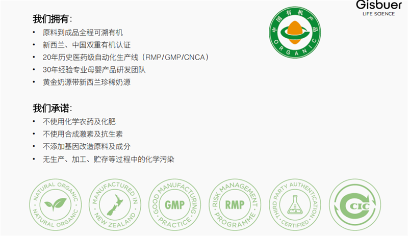 Gisbuer有機乳糖酶益生菌調制乳粉從原料到成品全程都可溯有機。有著新西蘭、中國等各國的雙重有機認證。30年經驗的母嬰產品研發團隊更加專業,20年歷史醫藥級自動化生產線更加可靠。并有包括HACCP(新西蘭初級產業部MPI認證 Codex Alimentarius), CNAS(中國國家認證認可監督管理委員會認證的嬰幼兒配方奶粉生產廠商Certified Infant Formula Manufacturer for China) GMP(新西蘭藥物與醫療器械安全局 NZ Medicines & Medical Devices Safety Authority) MPI(風險管理與海外出口(奶制品)認證 Risk Management & Export (Dairy) – 新西蘭初級產業部)等6大限全球公認的檢驗機構檢測。 甄選自全世界僅存1%有機認證奶源帶的新西蘭。值得消費者放心信賴。