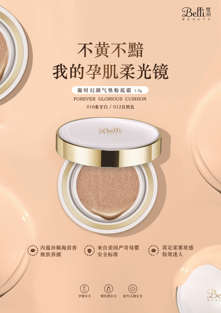 三重安全標準,呵護孕期底妝 Belli-beauty彩妝系列具備孕期、哺乳期、新生兒期三重安全標準,讓女性從懷孕到新生兒期,美麗不再有負擔。 ·孕期安全——全成分都通過嚴苛安全篩選,產品不含現代醫學已知的可能導致新生兒出生缺陷的成分。 ·哺乳期安全——經過美國LACT-MED(美國國立醫學圖書館藥物及哺乳醫療數據庫)篩查,不含對母乳喂養有害的成分。 ·新生兒期安全——不含雌激素、類雌激素等影響寶寶生長發育的不良成分,無憂親密接觸 Belli凝時幻顏氣墊粉底霜每種成分都經過孕期成分安全篩選體系層層篩選,貼心守護孕媽底妝安全,確保媽媽和寶寶的健康。 花瓣粉撲設計,底妝無死角 Belli凝時幻顏氣墊粉底霜,采用獨特花瓣形粉撲設計,可以照顧到鼻翼、眼角等死角部分,輕松上妝。用花瓣粉撲以少量多次方式按壓涂抹,15秒就可以快速打造出孕期底妝。