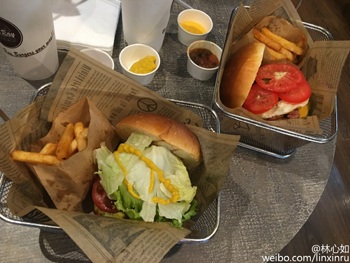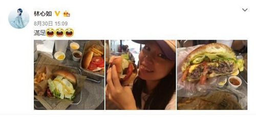 最近,林心如曬出自己與高熱量美食的合影---夾肉漢堡與薯條,這位準媽媽還大呼:“滿足!”照片中的林心如帶著帽子遮面,但看起來精神飽滿,元氣十足,一臉幸福。
