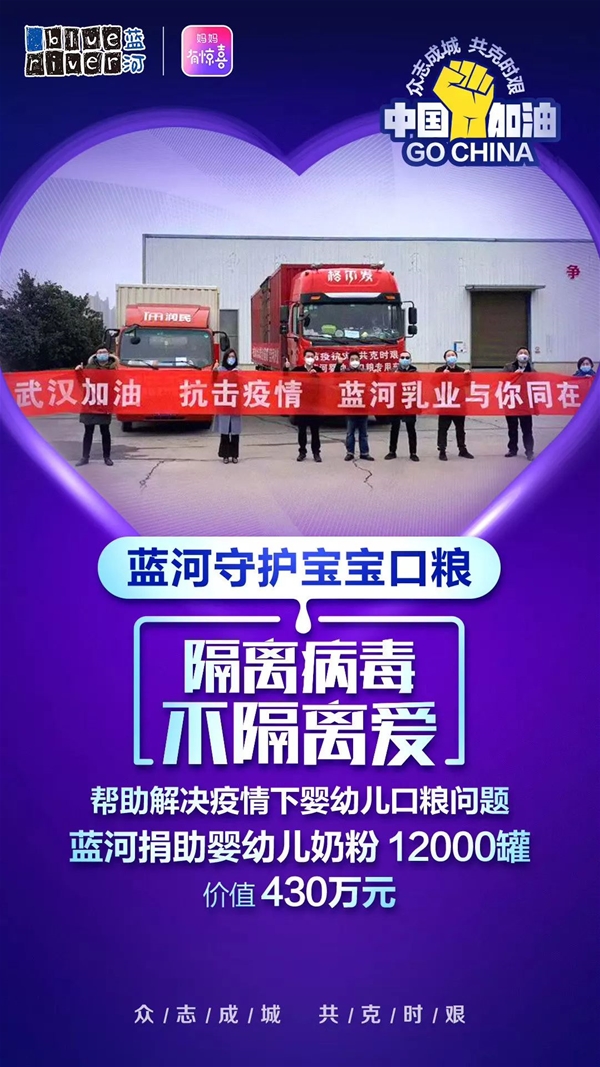 全力支持終端,排憂解難為客戶 疫情期間,眾多醫(yī)護人員、人民警察奮戰(zhàn)在防控一線,眾多基層工作人員筑起強大的后方保障……而各行各業(yè)的企業(yè)也參與到了疫情防控支援中,同心聚力伸援手,就如奶粉行業(yè),乳企們承受著巨大經(jīng)營壓力的同時不忘捐款捐物,為打贏疫情阻擊戰(zhàn)加油助力。 筆者了解到,為了支援湖北、湖南等疫情嚴重區(qū)域,藍河不僅向武漢大學(xué)中南醫(yī)院、武漢兒童福利院等機構(gòu)捐贈了嬰幼兒配方奶粉5460罐,合計價值約人民幣210萬元;還給湖南常德、岳陽等地捐贈了嬰幼兒配方奶粉6540罐,合計價值約人民幣220萬元,共計捐贈嬰幼兒配方奶粉12000罐,合計價值約人民幣430萬元。