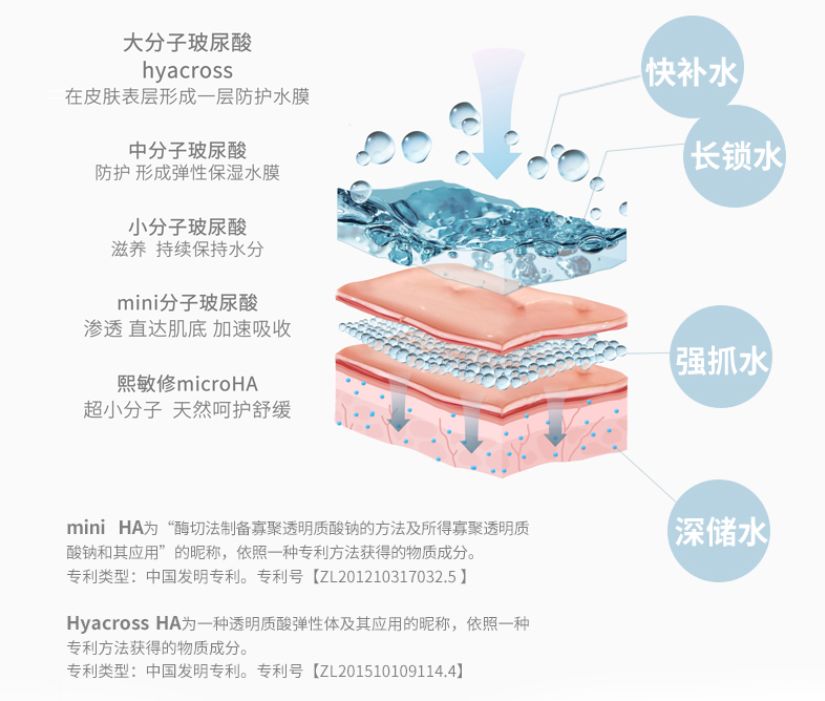 其中的熙敏修,這個(gè)小家伙值得我們來好好念叨念叨。它屬于華熙生物研發(fā)的最小分子的透明質(zhì)酸,采用專利酶切工藝,突破性分子量(≤5KDA),能迅速穿透肌膚表層,深入直達(dá)肌底,和其他的玻尿酸成分相比他的透皮吸收率真的hin高!
