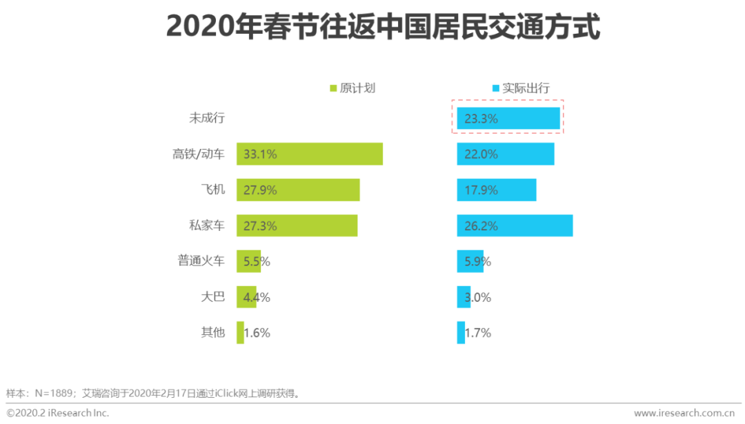 2020年春節(jié)往返交通方式 疫情打亂出行節(jié)奏,遠(yuǎn)途交通行業(yè)面臨用戶留存大考 2020年春節(jié),受疫情影響,出于安全考慮,23.3%用戶取消了原有出行返鄉(xiāng)計(jì)劃。各類主要交通工具中,高鐵/動(dòng)車和飛機(jī)受影響最嚴(yán)重,用戶比例大幅下降;其中,高鐵/動(dòng)車下降11.1%,飛機(jī)下降10.0%。 居民異地出行需求在未來一段時(shí)間將持續(xù)處于低谷,遠(yuǎn)途交通行業(yè)不僅面臨著各交通工具之間的替代性競(jìng)爭(zhēng),更面臨著嚴(yán)峻的用戶留存考驗(yàn),航空業(yè)眾多公司或面臨新一輪洗牌。