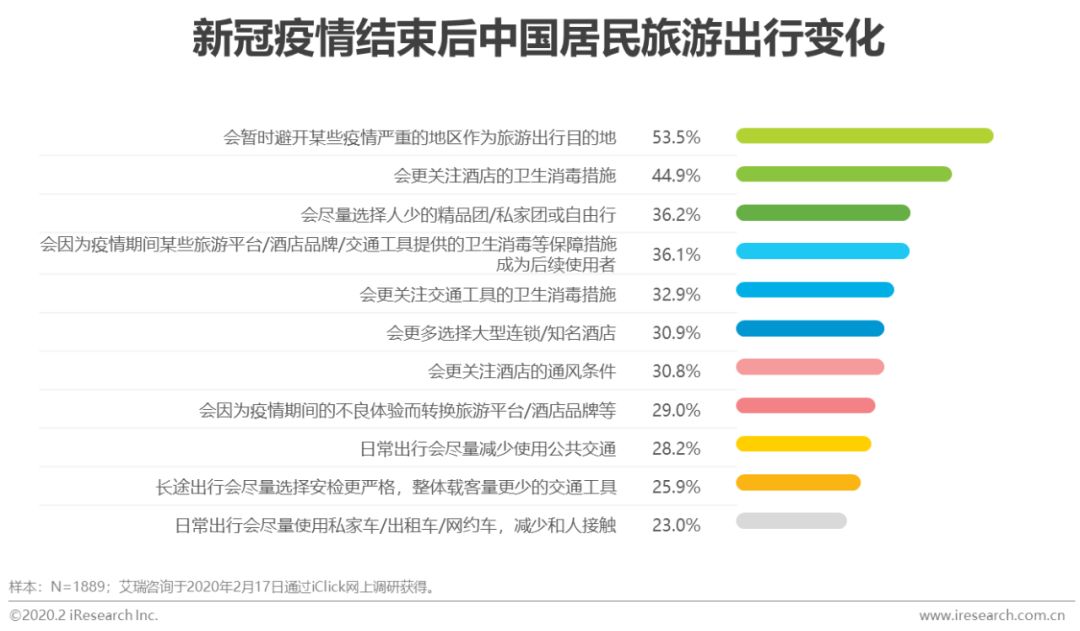 疫情結(jié)束后旅游出行變化 疫情高發(fā)區(qū)旅游業(yè)短期難恢復(fù),超1/3用戶面臨品牌新選擇 疫情結(jié)束后,仍有超半數(shù)用戶會(huì)暫時(shí)避開湖北、廣東等疫情嚴(yán)重的地區(qū)作為旅游出行目的地,疫情高發(fā)區(qū)旅游業(yè)不僅遭受嚴(yán)重打擊,且短期內(nèi)難以恢復(fù)。此外,旅客將更加關(guān)注旅游各環(huán)節(jié)(旅行社、酒店、旅游大巴、景點(diǎn)等)衛(wèi)生消毒措施,超1/3用戶將因?yàn)橐咔槠陂g品牌的安全保障措施面臨新選擇。旅游相關(guān)行業(yè)要提前制定應(yīng)對(duì)策略,重點(diǎn)通過衛(wèi)生消毒措施等方式做好疫情后的用戶留存和拉新。