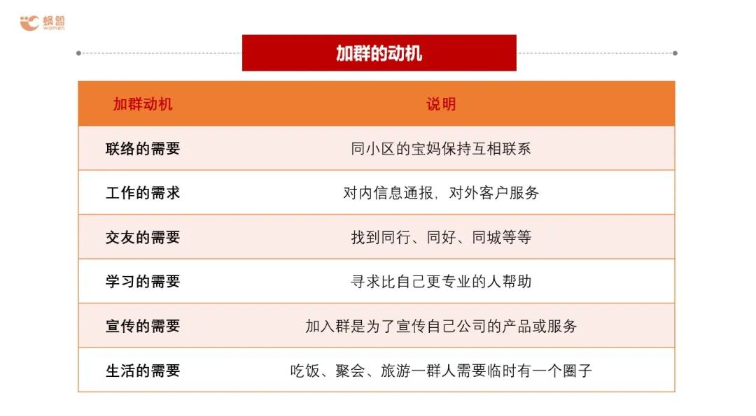 需要找到加群的人的屬性,也就是為什么加群,社群是為了滿足溝通的,傳播,社交的需求。 疫情期間,社區電商是剛需,而當疫情過去,滿足生活剛需不再只有社群,需要考慮的是疫情過去依然保持社群的活躍度,所以,在疫情期間不要只考慮訂貨、送貨,同樣需要建立起一整套社群打法。