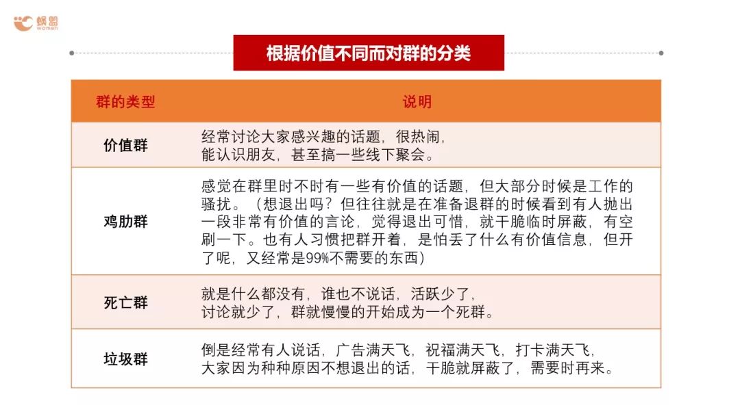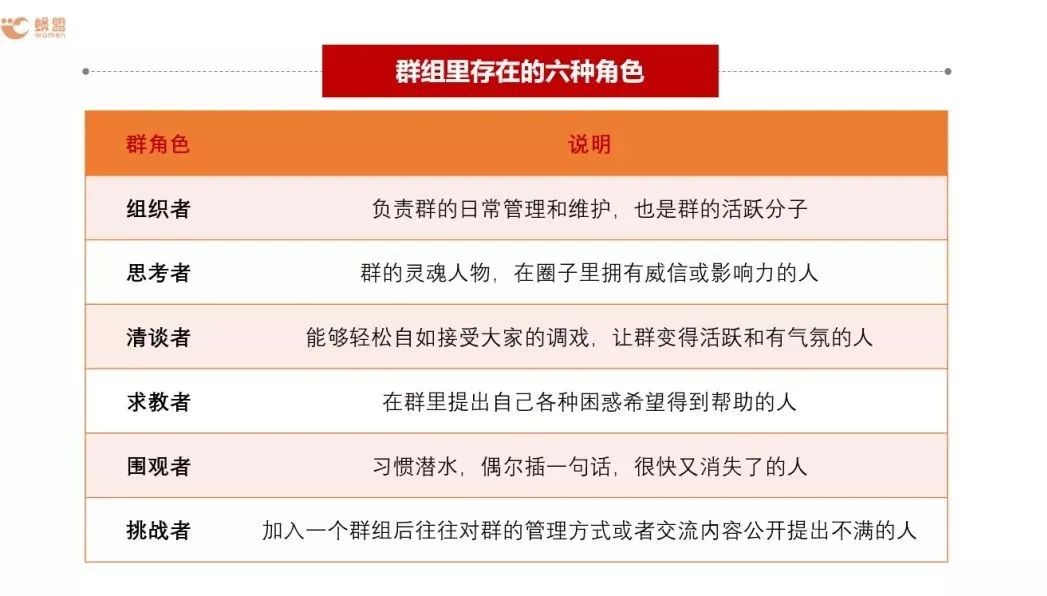 社群需要職能劃分,負責維護群的組織者是群主,或者是店老板,思考者是需要在關鍵時刻一錘定音的人,或者是具備專業素能的醫護人員,還有就是活躍群的人,有帶動話題的能力。求教者是在群里引導問題的人,還有常見的圍觀者和挑戰者。