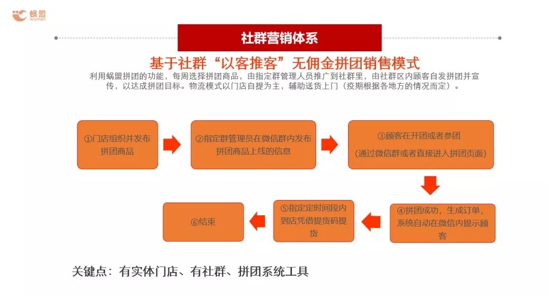 需要向社區電商學習,核心模式是:社區+社群,操作模式是團長+合伙人;每個門店都有忠實粉絲,能達成價值觀的一致,極容易成為團長/合伙人;