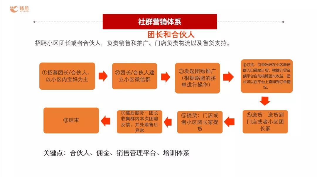 那么社區電商是如何操作團長/合伙人的呢?以寶媽為主,協助團長/合伙人建立小區的微信群,發起團購推廣,這些活動蝸盟都是支持的。分傭機制極大地鼓勵了傳播度。