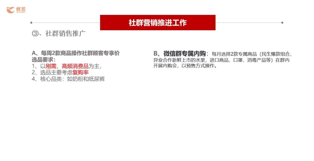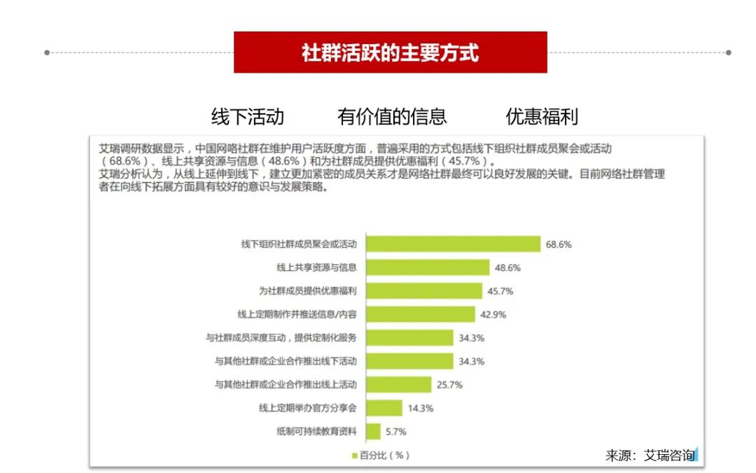 在社群中需要做銷售推廣時,建議將產品分為兩大類:一是門店相關的產品,享受專享價,選品以高頻剛需或低價為主,主要考慮復購率。社群營銷中容易爆火的反而是線下門店不常賣的產品,打造本地化生態圈,可以進行異業合作,幫異業門店承擔團購之類的活動,可有效的活躍和豐富社群,劃重點!做鮮活的社群!采用不同的活動玩法,不同的產品形式等等來打造鮮活的社群。以下是常見的活躍社群的方式: 1. 線下組織一些活動,例如:西瓜采摘群,草莓采摘群,跨年分享群 2. 承載一些共享資源,例如:異業優惠券 3. 聯合品牌廠家的福利政策,例如:篩選出群活躍前10名享受一元購活動等等。