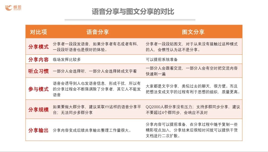 那么干貨分享如何讓落地呢?可分為語音分享/圖文分享。 語音分享親和力很強,能感受到分享者的情緒,也分具有人情味兒,弊端是很容易被打散且聽起來不太方便;圖文分享便是閱讀效率高,方便匯總,但欠缺人情味兒。具體實施方式可自行選擇合適的。 課程分享總結 1. 現在開始做社群晚不晚? 不晚,也希望大家不要沉迷于現在社群的虛假繁榮狀態,時時刻刻警惕疫情過后需要打響的持久戰。 2.做好社群管理需要基于做好社區的社交屬性,拼團便是核心工具,一定要熟練運用可帶來爆發式增量,參考拼多多。 3.社群日常活躍的方式:需要建立社群的基本群規和管理角色的分配 4.通過各類活動提高社群活躍度