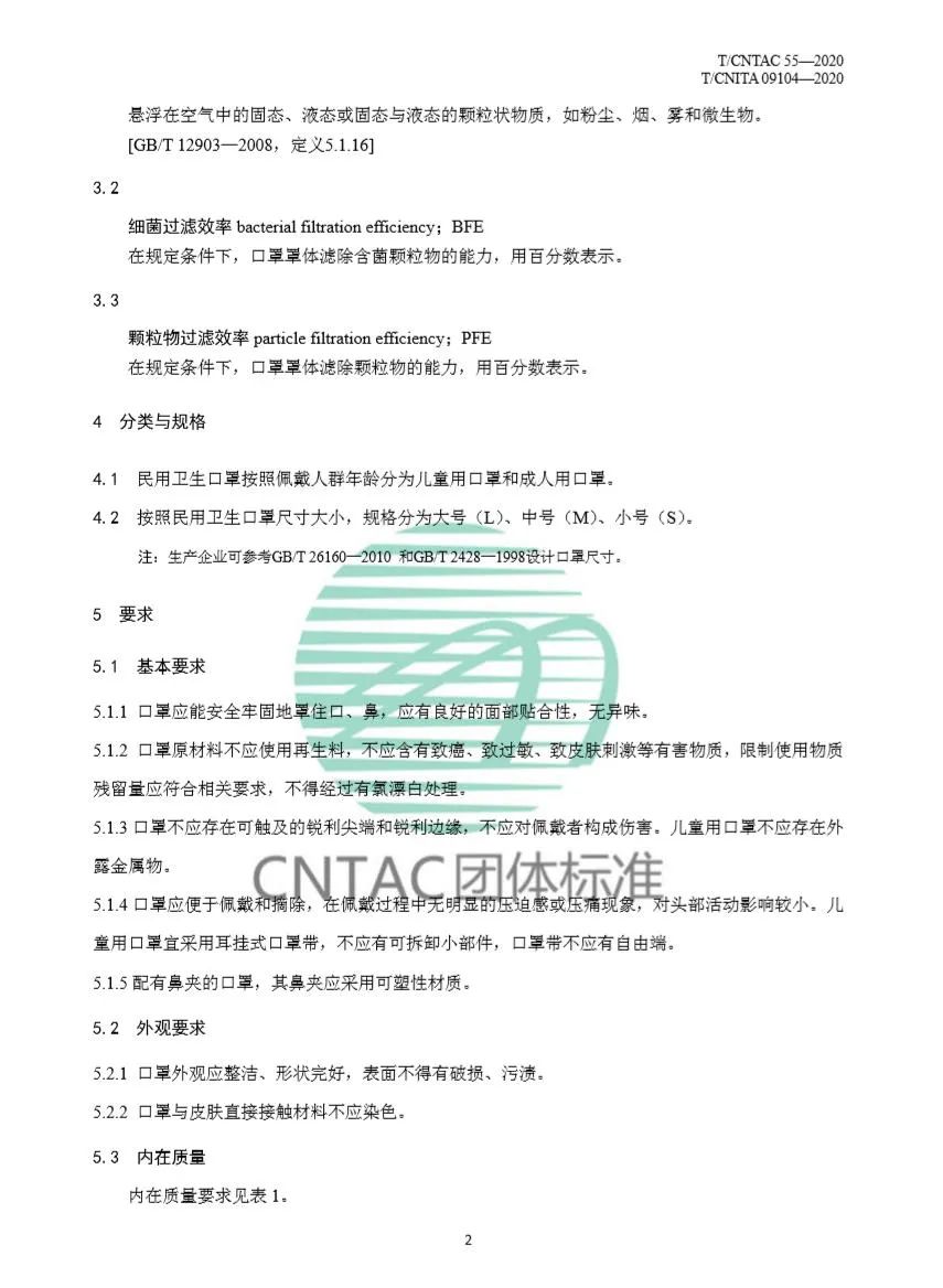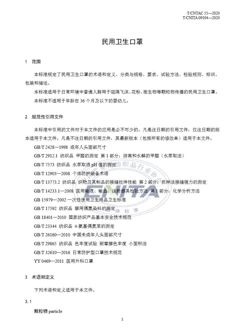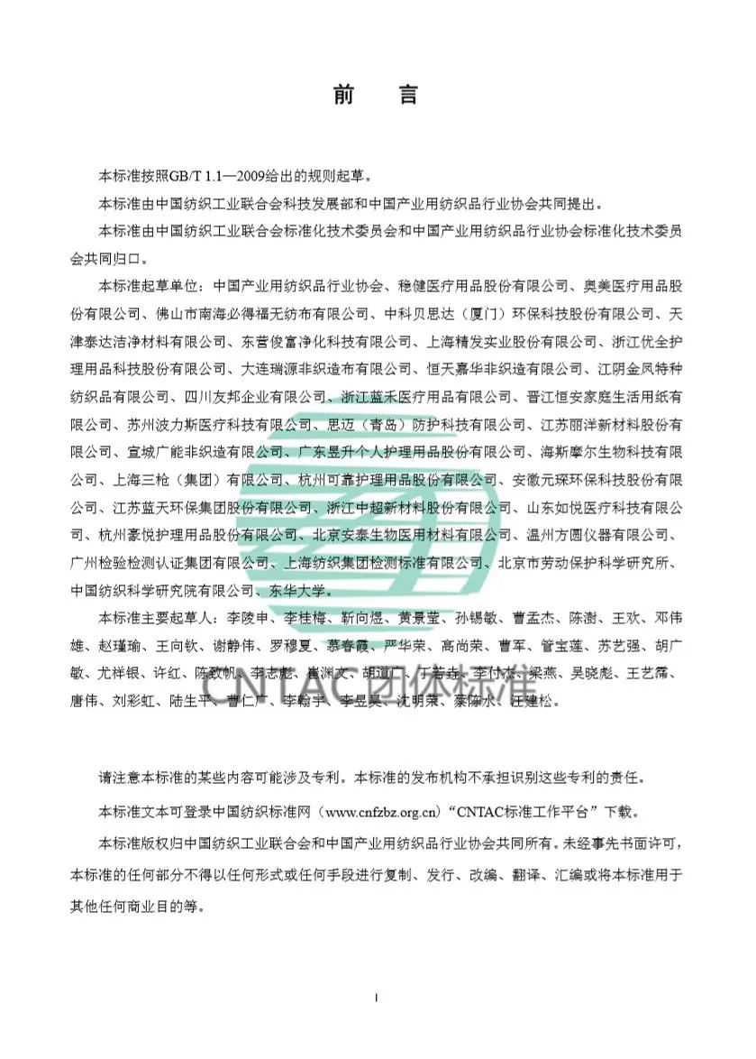 《民用衛生口罩》的編制團隊 起草單位涵蓋口罩研發、生產、材料、檢測、管理全產業鏈。專家團隊來自行業協會、口罩生產企業、材料生產企業、醫療器械使用單位、科研院所及檢測單位。 起草單位名單:中國產業用紡織品行業協會、穩健醫療用品股份有限公司、奧美醫療用品股份有限公司、佛山市南海必得福無紡布有限公司、中科貝思達(廈門)環保科技股份有限公司、天津泰達潔凈材料有限公司、東營俊富凈化科技有限公司、上海精發實業股份有限公司、浙江優全護理用品科技股份有限公司、大連瑞源非織造布有限公司、恒天嘉華非織造有限公司、江陰金鳳特種紡織品有限公司、四川友邦企業有限公司、浙江藍禾醫療用品有限公司、晉江恒安家庭生活用紙有限公司、蘇州波力斯醫療科技有限公司、思邁(青島)防護科技有限公司、江蘇麗洋新材料股份有限公司、宣城廣能非織造有限公司、廣東昱升個人護理用品股份有限公司、海斯摩爾生物科技有限公司、上海三槍(集團)有限公司、杭州可靠護理用品股份有限公司、安徽元琛環保科技股份有限公司、江蘇藍天環保集團股份有限公司、浙江中超新材料股份有限公司、山東如悅醫療科技有限公司、杭州豪悅護理用品股份有限公司、北京安泰生物醫用材料有限公司、溫州方圓儀器有限公司、廣州檢驗檢測認證集團有限公司、上海紡織集團檢測標準有限公司、北京市勞動保護科學研究所、中國紡織科學研究院有限公司、東華大學 標準文本如下: