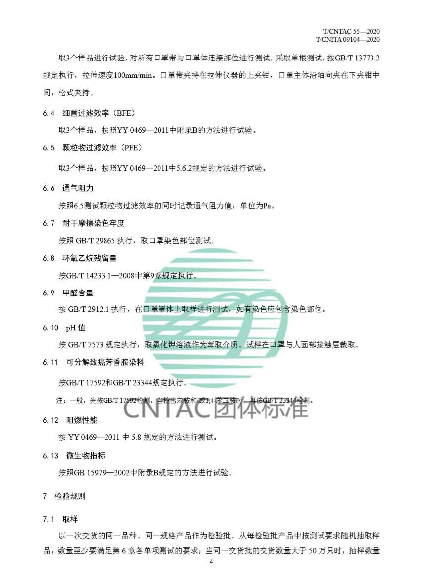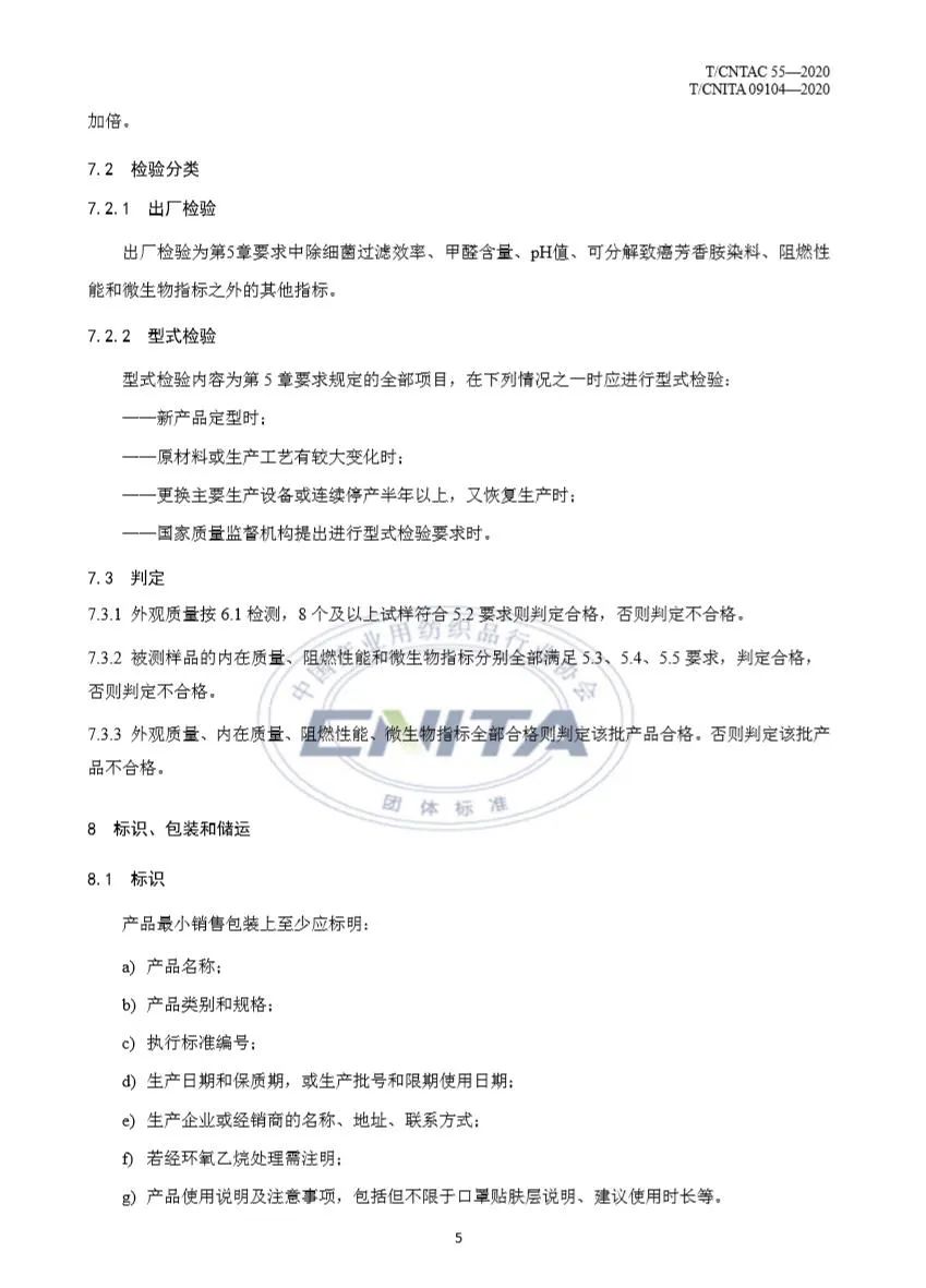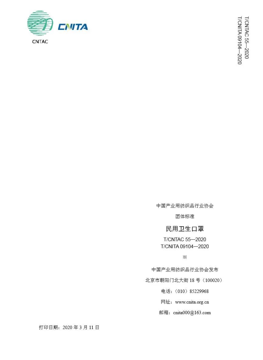 為什么要做《民用衛生口罩》? 疫情期間,口罩需求急劇增加,出現了民用口罩企業采標亂、市場監管難、消費者無從辨別等一系列新問題。 目前國家相關口罩標準中沒有對兒童口罩進行專門規定,疫情期間兒童應該選用什么樣的口罩,也成為社會焦點所在! 現有口罩標準 民用防護型口罩標準:GB/T 32610—2016 《日常防護型口罩技術規范》,GB 2626—2006《呼吸防護用品自吸過濾式防顆粒物呼吸器》,主要適用于顆粒物防護,在本次疫情中發揮了重要作用,但是復工復產中大量使用了阻隔型口罩(平面型口罩為主),無法滿足上述兩個標準要求。 醫用領域標準:GB 19083—2010《醫用防護口罩技術要求》、YY 0469—2011《醫用外科口罩》、YY/T 0969—2013《一次性使用醫用口罩》,主要適用于醫療領域。 《民用衛生口罩》制定過程 1、立項準備階段 口罩需求量上漲,標準遇到新問題。 為滿足疫情緊急情況下民眾對口罩的需求、轉產口罩企業的采標,保證產品質量和市場監管,中國產業用紡織品行業協會提出立項申請,快速起草《衛生用口罩》團體標準。 2、標準起草階段 2月25日編制計劃下達。中國產業用紡織品協會成立標準起草小組,在前期行業調研的基礎上,對標分析、重點討論,確定框架,編制標準,并根據標準適用性將標準名稱變更為《民用衛生口罩》。 2月28日完成標準征求意見稿。 3、征求意見階段 3月4日,標準完成征求意見稿的社會意見征求,共收到意見103 條,其中采納34 條,部分采納23 條。起草組進一步完善標準,形成送審稿和編制說明。 4、標準報批階段 中紡聯和中產協標委會分別對標準送審稿進行函審,起草組根據函審意見,再次完善標準文本和編制說明,形成報批稿。 5、標準發布 3月11日,T/CNTAC 55—2020、T/CNITA 09104—2020《民用衛生口罩》標準發布。 《民用衛生口罩》使用場景 本標準適用于日常環境中普通人群用于阻隔飛沫、花粉、微生物等顆粒物傳播的民用衛生口罩。 本標準圍繞口罩應具備的功能及佩戴安全性設定指標,主要包括材料及佩戴安全性、必要的阻隔功能,并且特別關注佩戴舒適性。 《民用衛生口罩》的主要內容 13項標準指標為口罩性能保駕護航: 適合復工復學佩戴,可有效阻隔飛沫、花粉、微生物等顆粒物傳播; 分為成人口罩和兒童口罩,規格分別為大號(L)中號(M)小號(S); 明確佩戴的安全性和材料,不應存在可觸及的銳利尖端和銳利邊緣,兒童用口罩宜采用耳掛式口罩帶,不應有可拆卸小部件等,兒童口罩帶不應有自由端,口罩原材料不應使用再生料,口罩與皮膚直接接觸材料不得染色等; 突出口罩阻隔功能,細菌過濾效率不低于95%,顆粒物過濾效率不低于90%; 突出口罩佩戴舒適性,成人用口罩通氣阻力定為≤49Pa,兒童用口罩通氣阻力定為≤30Pa; 并且明確規定了環氧乙烷殘留量、耐干摩擦色牢度、甲醛含量、pH值、可分解致癌芳香胺染料、微生物指標、阻燃性能等指標; 兒童口罩有要求:
