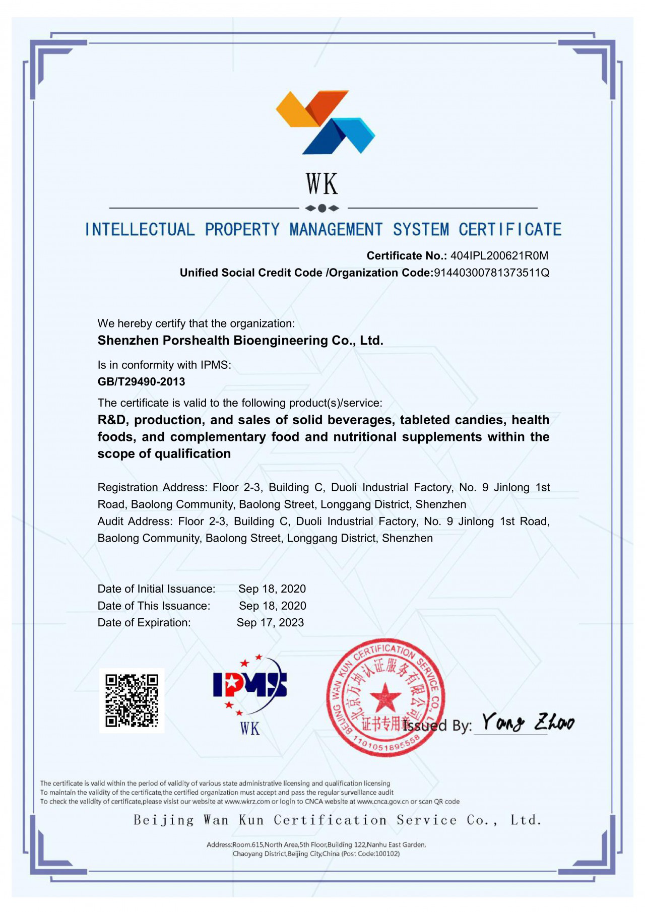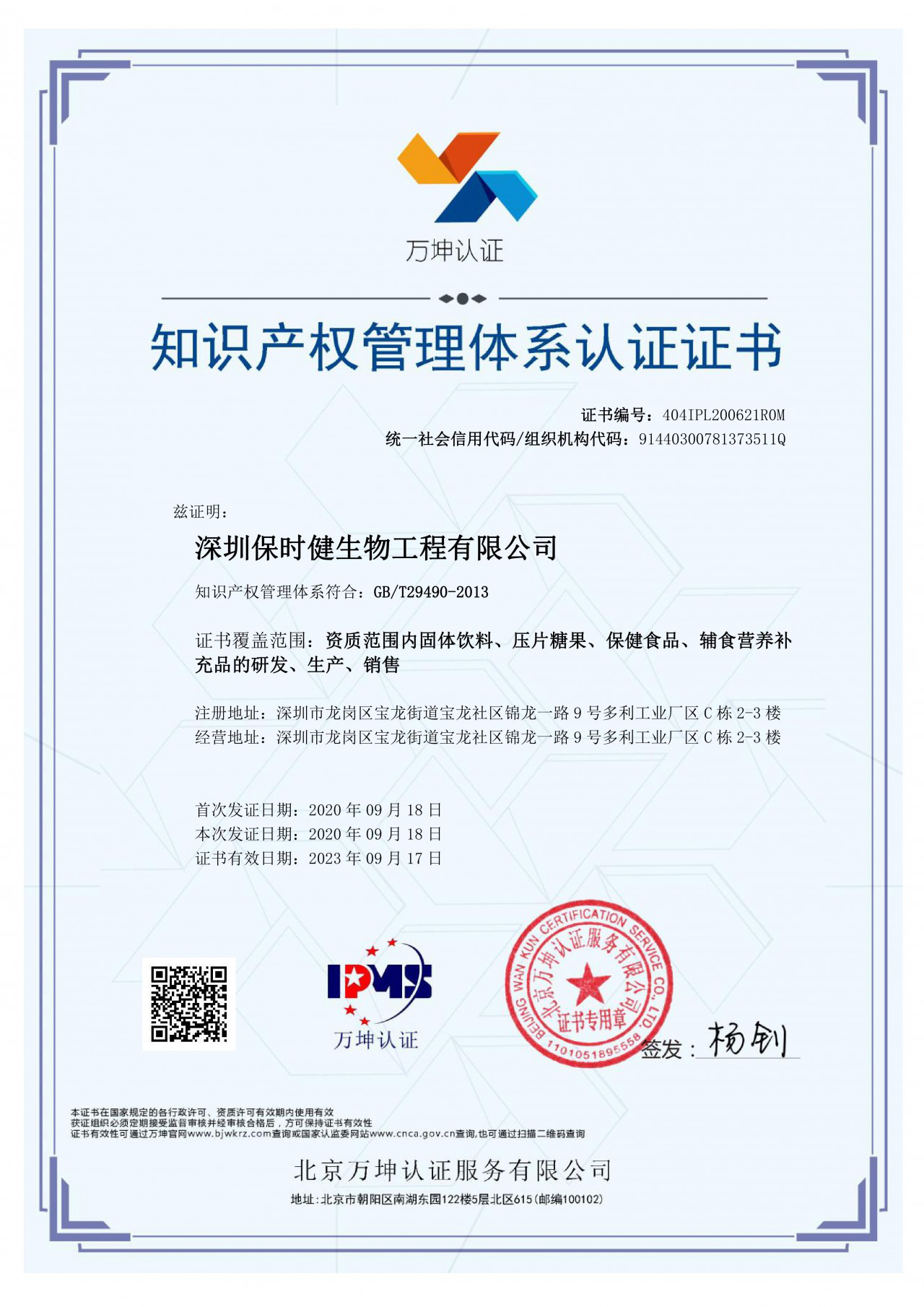 2020年9月18日,貝蜜兒控股工廠(深圳保時健生物)順利通過GB/T29490-2013知識產權管理體系認證審核,正式獲得知識產權管理體系認證證書。