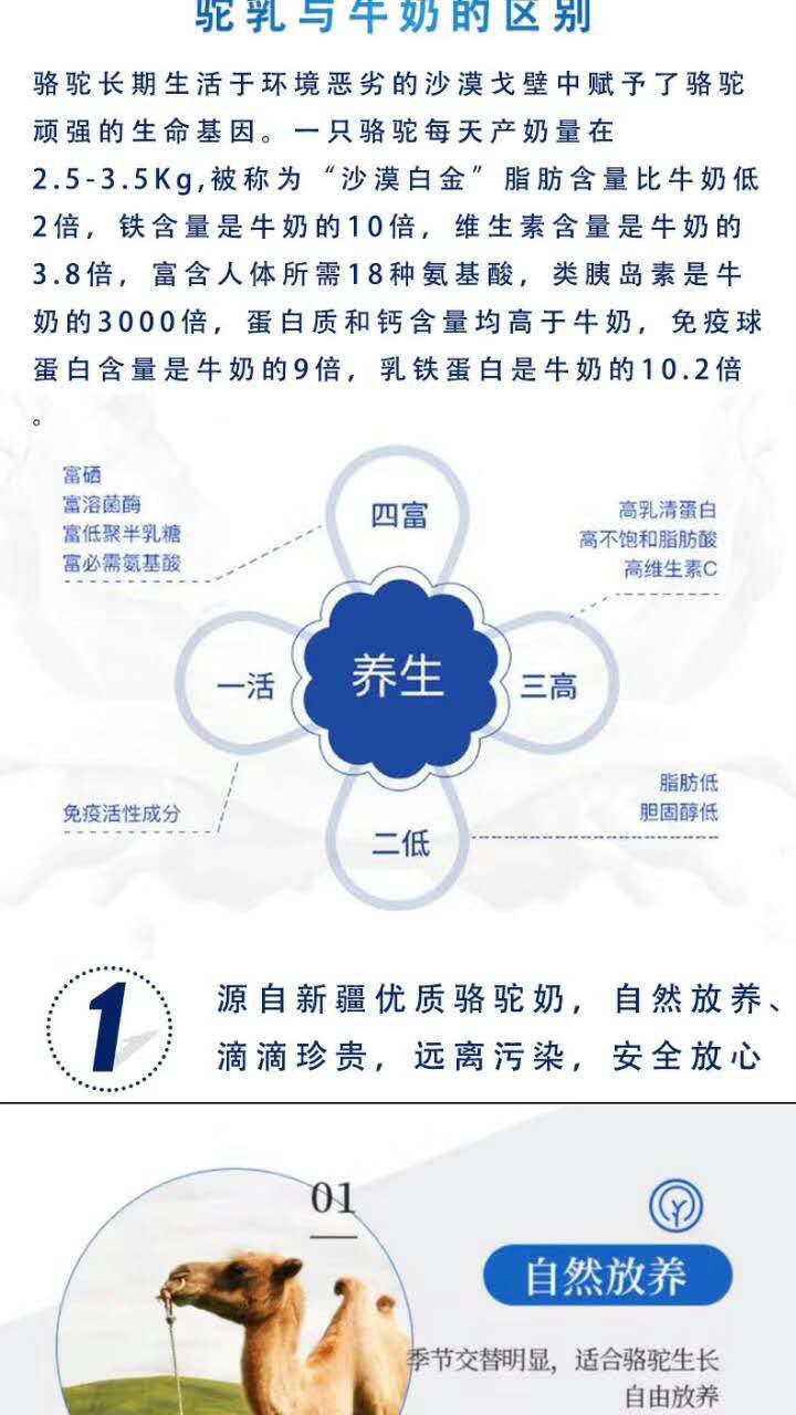 乳糖不耐受人群福音(駱駝不含過(guò)敏源,駝奶乳糖含量極低) ️糖尿病人一定要喝的奶(每毫升富含52個(gè)微單位的胰島素因子) ️有助于小朋友生長(zhǎng)發(fā)育和智力發(fā)育(鈣含量是牛奶的10倍)