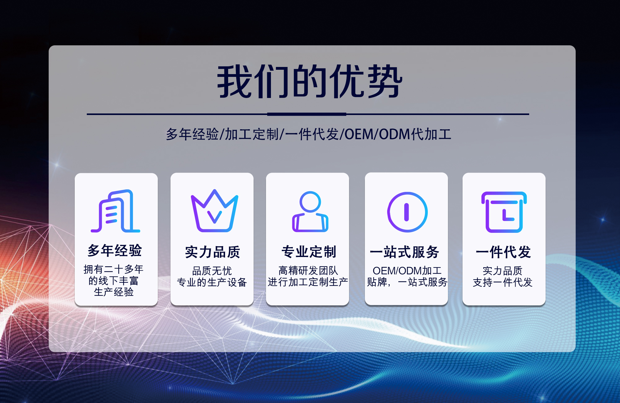找產(chǎn)品 代工產(chǎn)品,上善集團(tuán)為您制作一切所需所想,免去您建廠、研發(fā)、生產(chǎn)、等金額的投資風(fēng)險!我們期待著與您的合作!