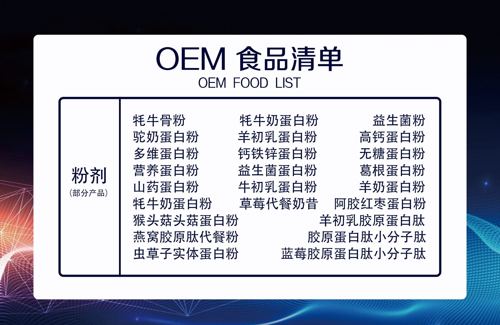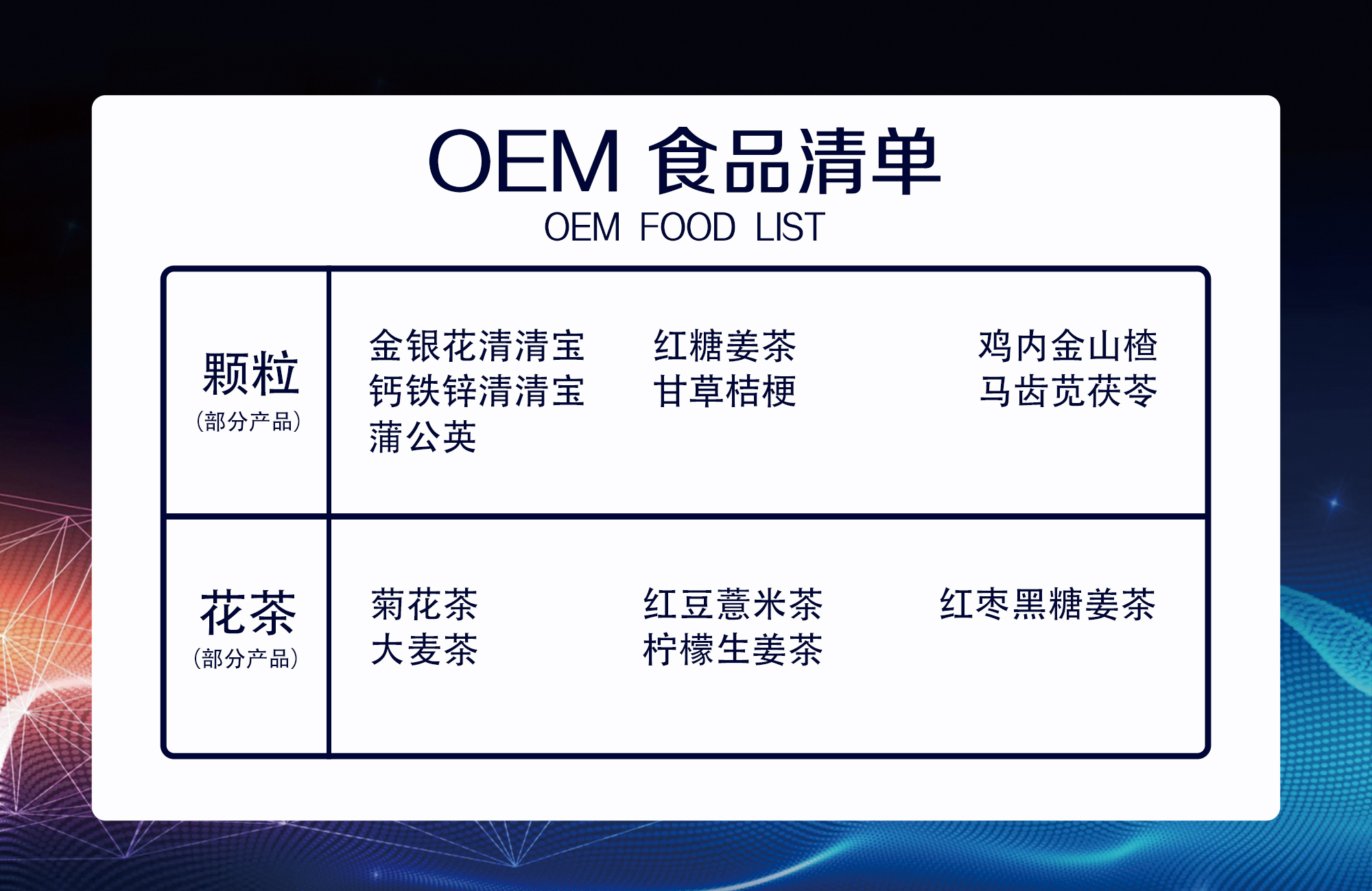 10萬級GMP無塵生產(chǎn)車間,與南昌大學(xué)食品工程學(xué)院聯(lián)合研發(fā)生產(chǎn)。資質(zhì)俱全 專業(yè)承接各類OEM食品/保健食品代加工項(xiàng)目。包含保健食品,粉劑,顆粒、壓片糖果、粉劑,口服液、代用茶。我們有專業(yè)的研發(fā)團(tuán)隊(duì)為您量身定制產(chǎn)品,專業(yè)的生產(chǎn)工廠為您塑造暢銷品種,專業(yè)的物流團(tuán)隊(duì)為您的運(yùn)輸保駕護(hù)航!我們的競爭優(yōu)勢就是一站式服務(wù),讓您安枕無憂!我們的宗旨就是:把控每一步的質(zhì)量環(huán)節(jié),用我的行動換取您的信任與支持,全身心投入到市場開發(fā)的浪潮,為合作伙伴騰飛做出一點(diǎn)點(diǎn)貢獻(xiàn)!
