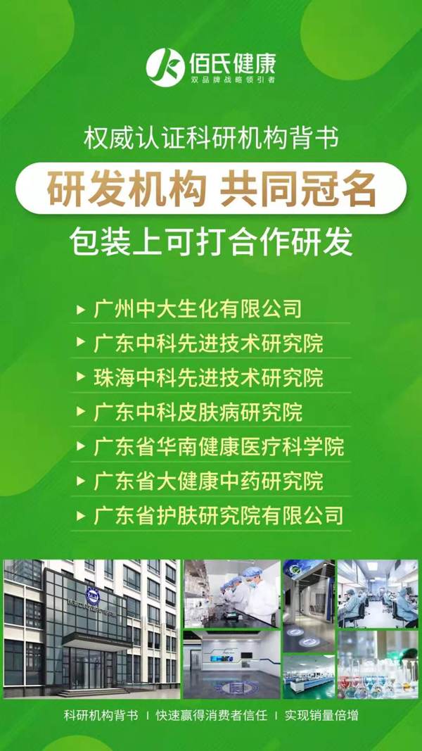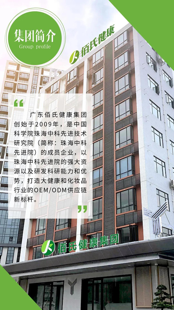 廣東佰氏健康集團創始于2009年,是中國科學院珠海中科先進技術研究院(簡稱:珠海中科先進院)的成員企業,以珠海中科先進院的強大資源以及研發科研能力和優勢,打造大健康和化妝品行業的0EM/ODM供應鏈新標桿。