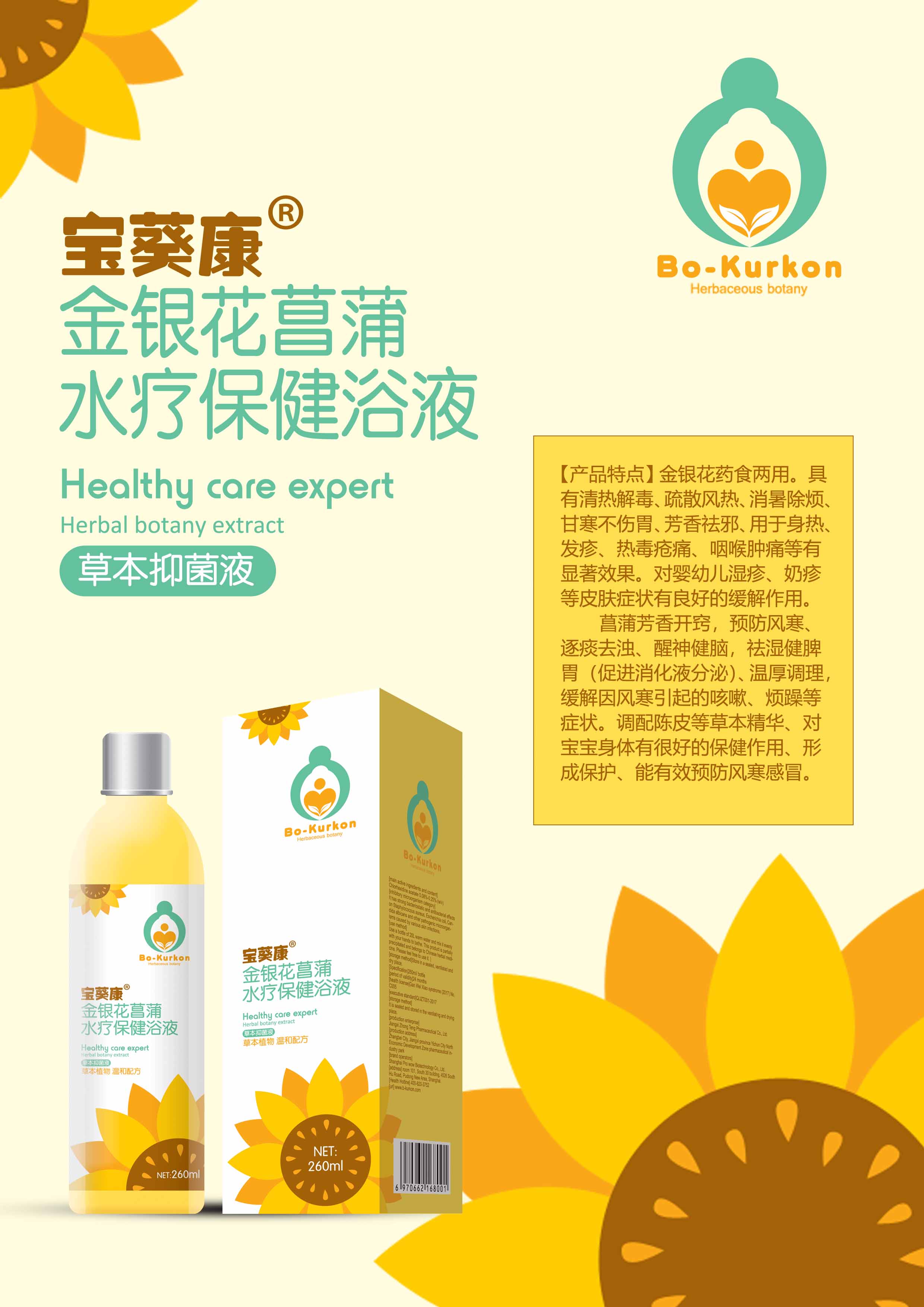 富含黃芪、野菊花等植物精華成分,有殺菌解毒、瀉火涼血、清熱燥濕、健胃安脾等作用。 寶葵康金銀花菖蒲水療保健浴液